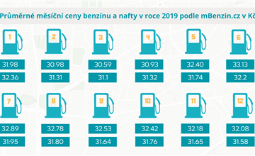 Průměrné ceny benzínu, nafty a LPG po měsících v roce 2019 podle mBenzin.cz