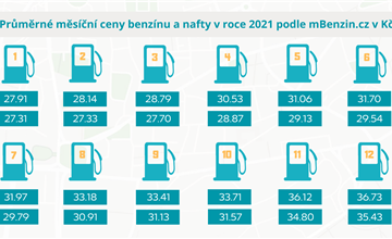 Průměrné ceny benzínu, nafty a LPG po měsících v roce 2021 podle mBenzin.cz